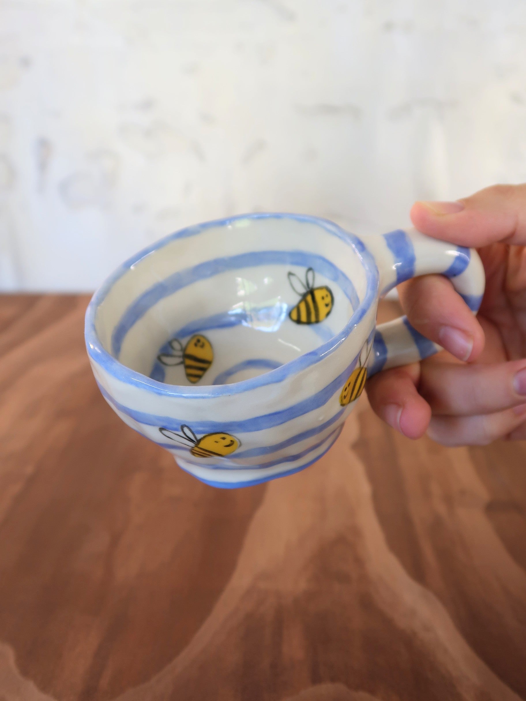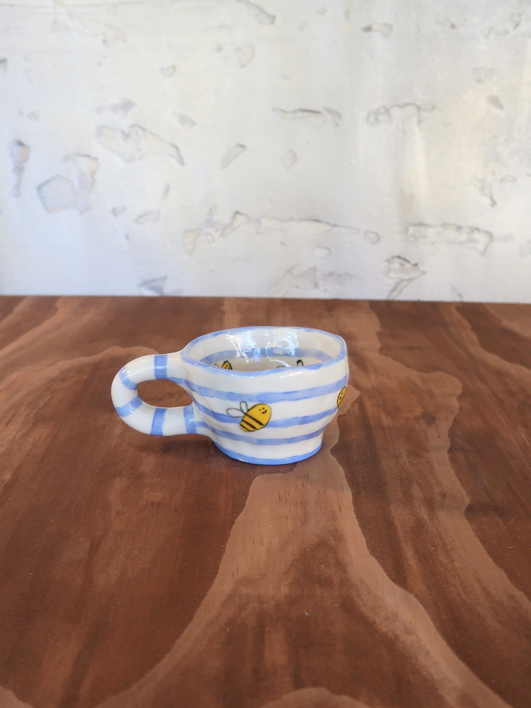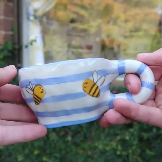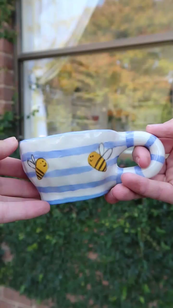 This hand-painted and hand-pinched cup is buzzing with charm. Cheerful little bees fly across a soft blue-and-white striped background, bringing a garden-fresh feel to every sip.