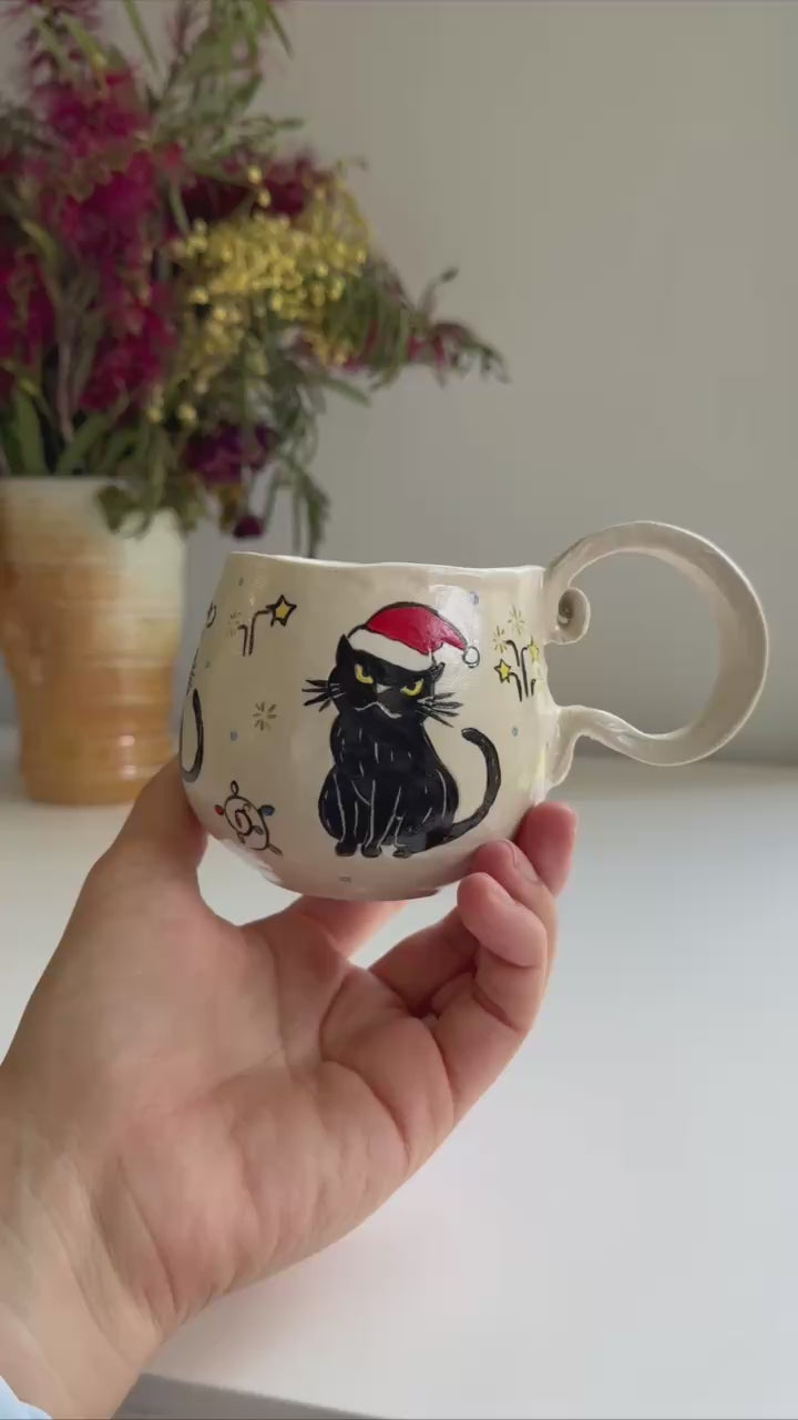Bring a touch of holiday magic to your mornings with this handmade ceramic mug featuring adorable festive cats 🐾🎄✨. Each mug is carefully hand-built from stoneware clay, hand-painted with charming Christmas designs, and finished with a glossy, food-safe glaze.