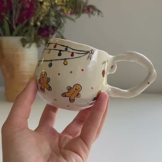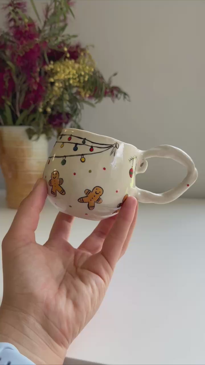 Sip your favorite winter drinks in style with this handmade ceramic mug featuring a whimsical Christmas design 🎄✨. Each mug is carefully hand-built from stoneware clay, hand-painted with festive patterns, and finished with a glossy, food-safe glaze.