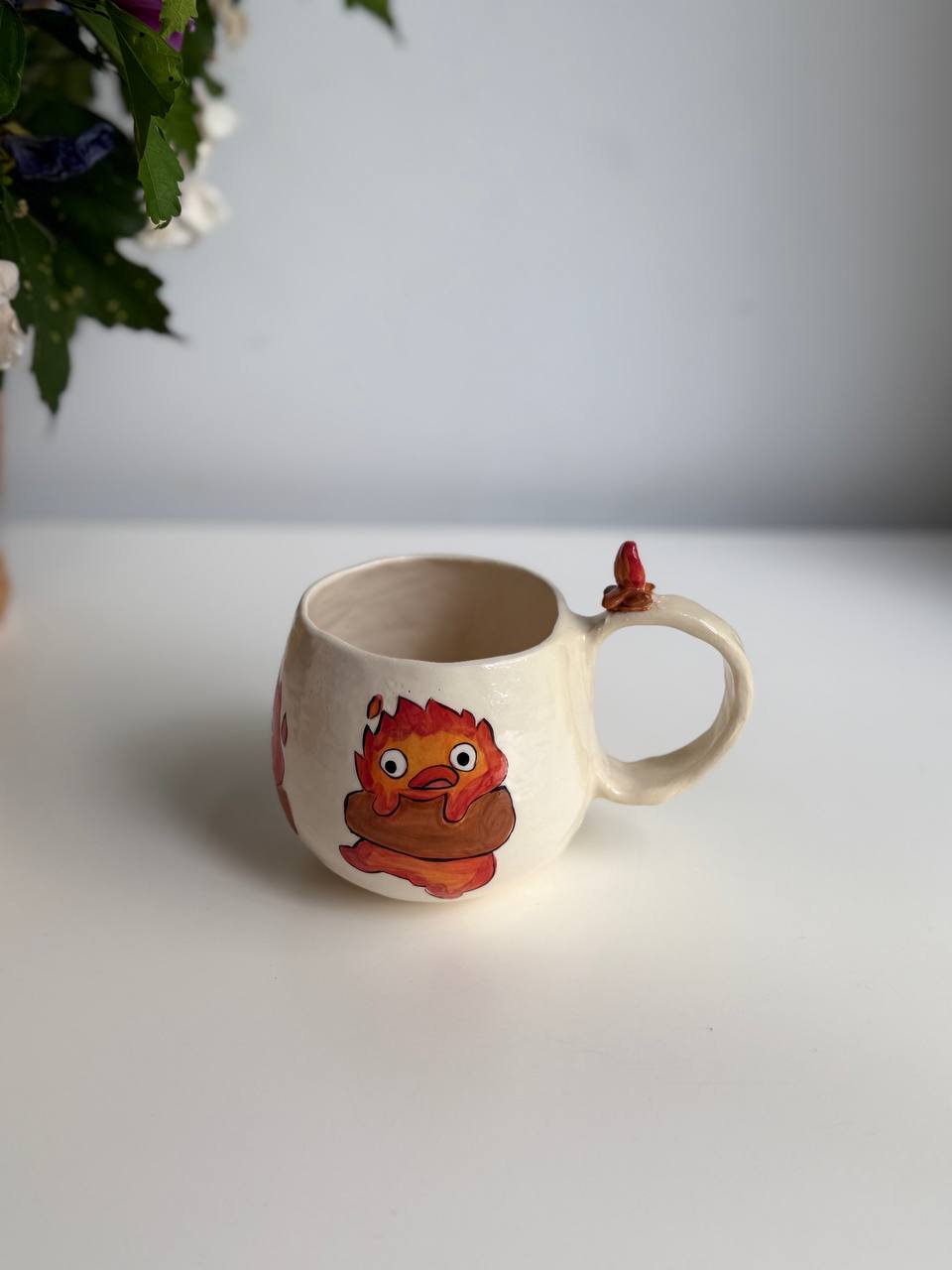 Meet Calcifer, your little fiery companion! This handmade stoneware mug features a tiny 3D Calcifer perched on the handle, adding a playful spark to your drink time. Perfect for any Studio Ghibli fan or anyone who loves a bit of magic with their coffee or tea.