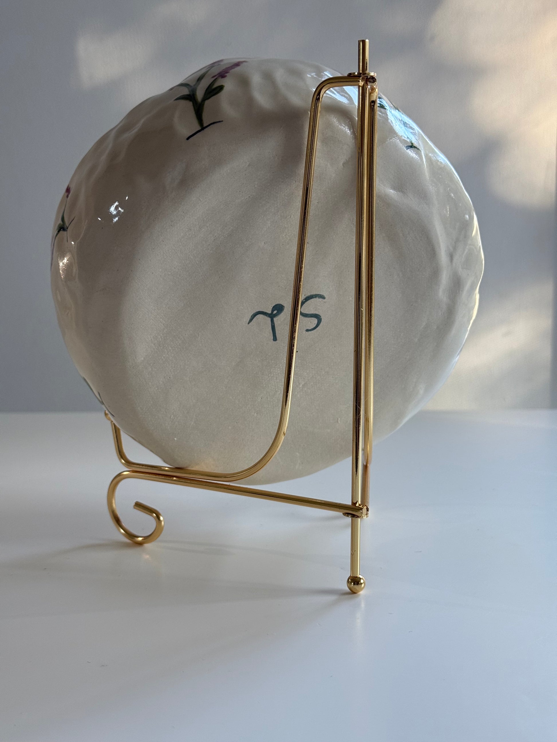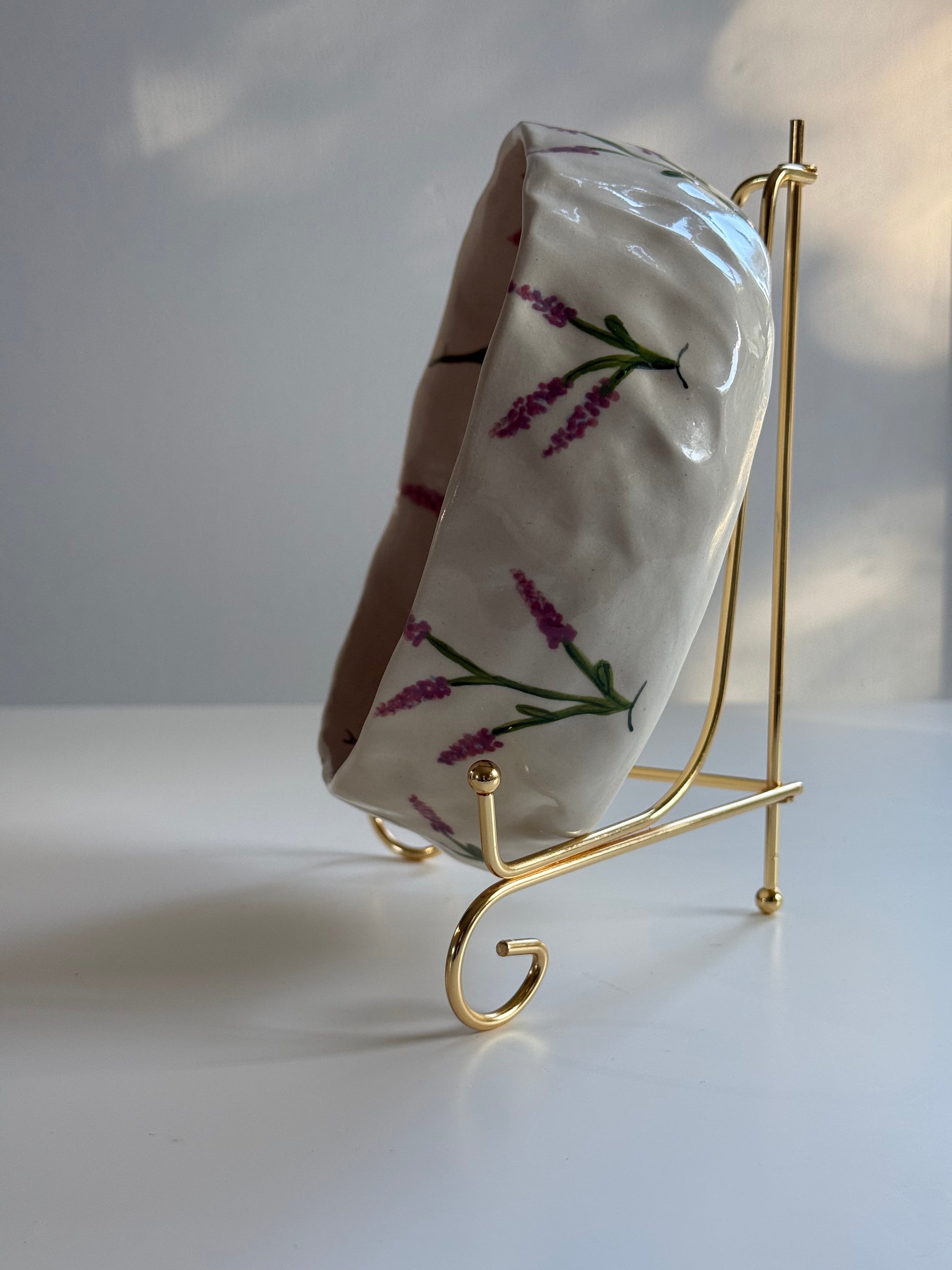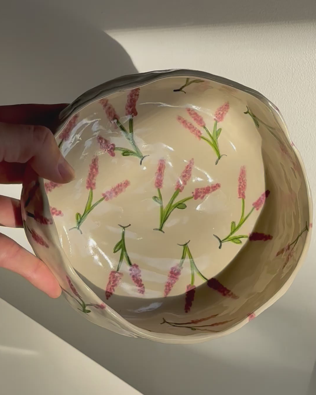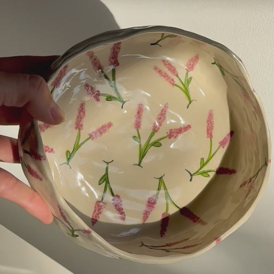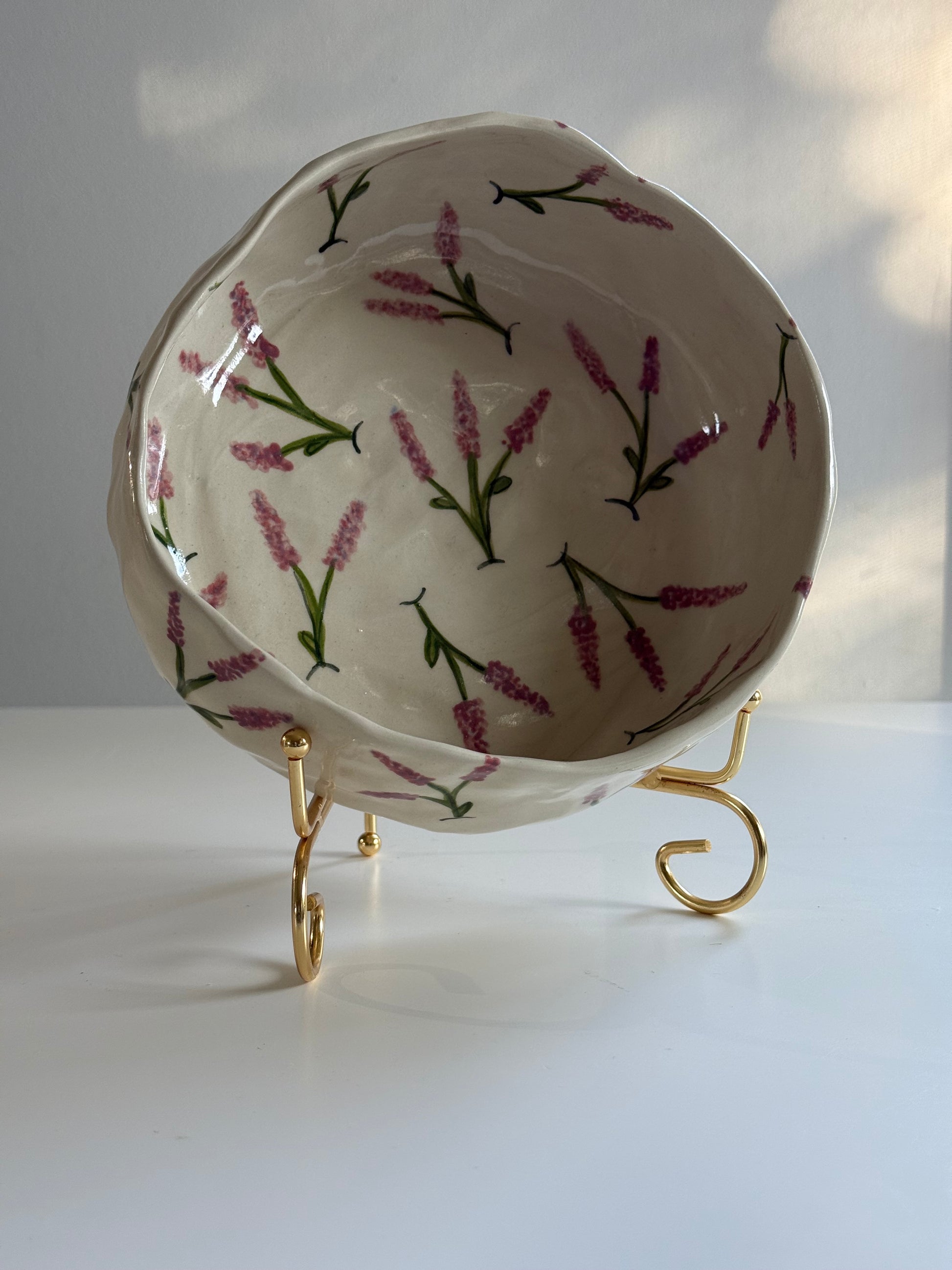 This hand-built bowl is decorated with a scattering of hand-painted lavender sprigs across a soft, glazed surface. Its organically shaped body and subtle irregularity give it personality and tactile appeal.