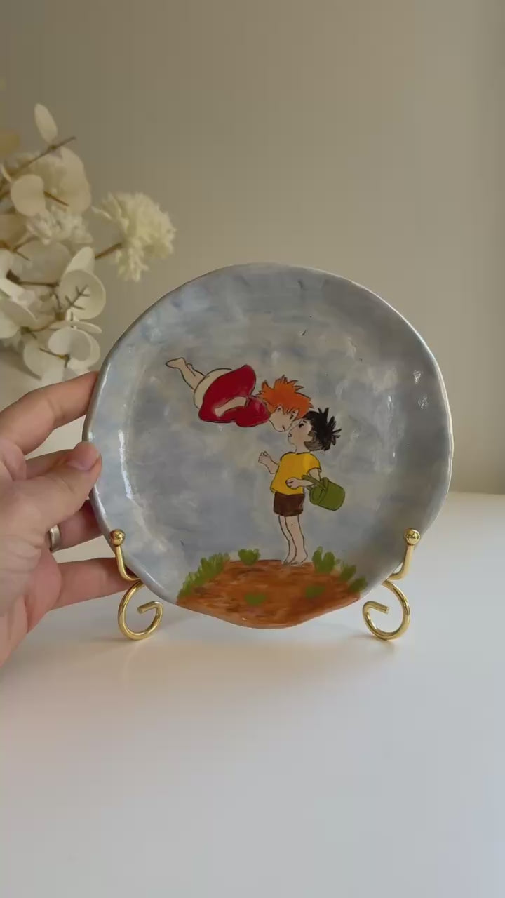 Bring the magic of Studio Ghibli into your home with this handmade ceramic trinket plate, capturing one of the most iconic moments from Ponyo 🐠✨. The plate features Ponyo and Sosuke in a charming, detailed hand-painted illustration that celebrates the warmth and friendship of this beloved film.