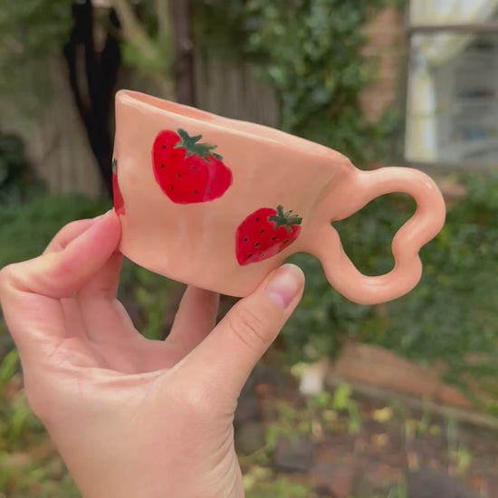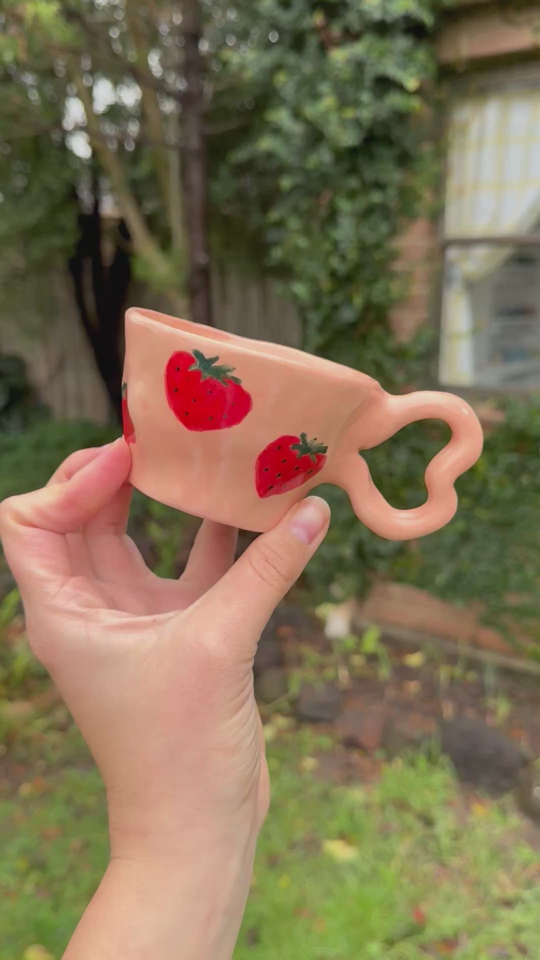 This hand-painted and hand-pinched cup is a sweet little tribute to strawberry season. With its soft blush tones and cheerful red berries, it feels playful and fresh—like a picnic in a cup.