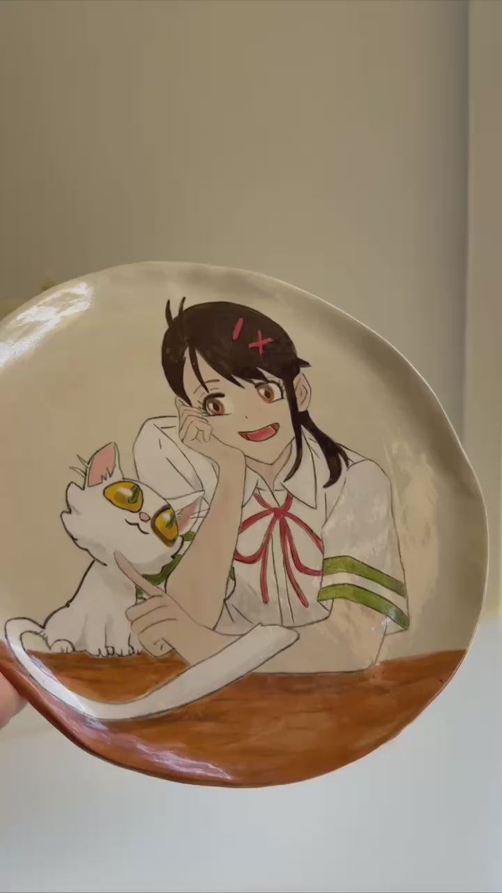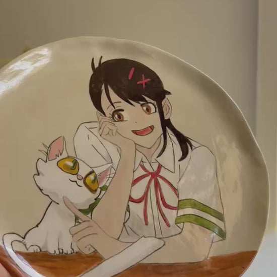 This plate is carefully hand-painted with underglazes and fired to create a durable, one-of-a-kind artwork you can use or display. The illustration features Suzume and Daijin, perfect for anime lovers and collectors alike.