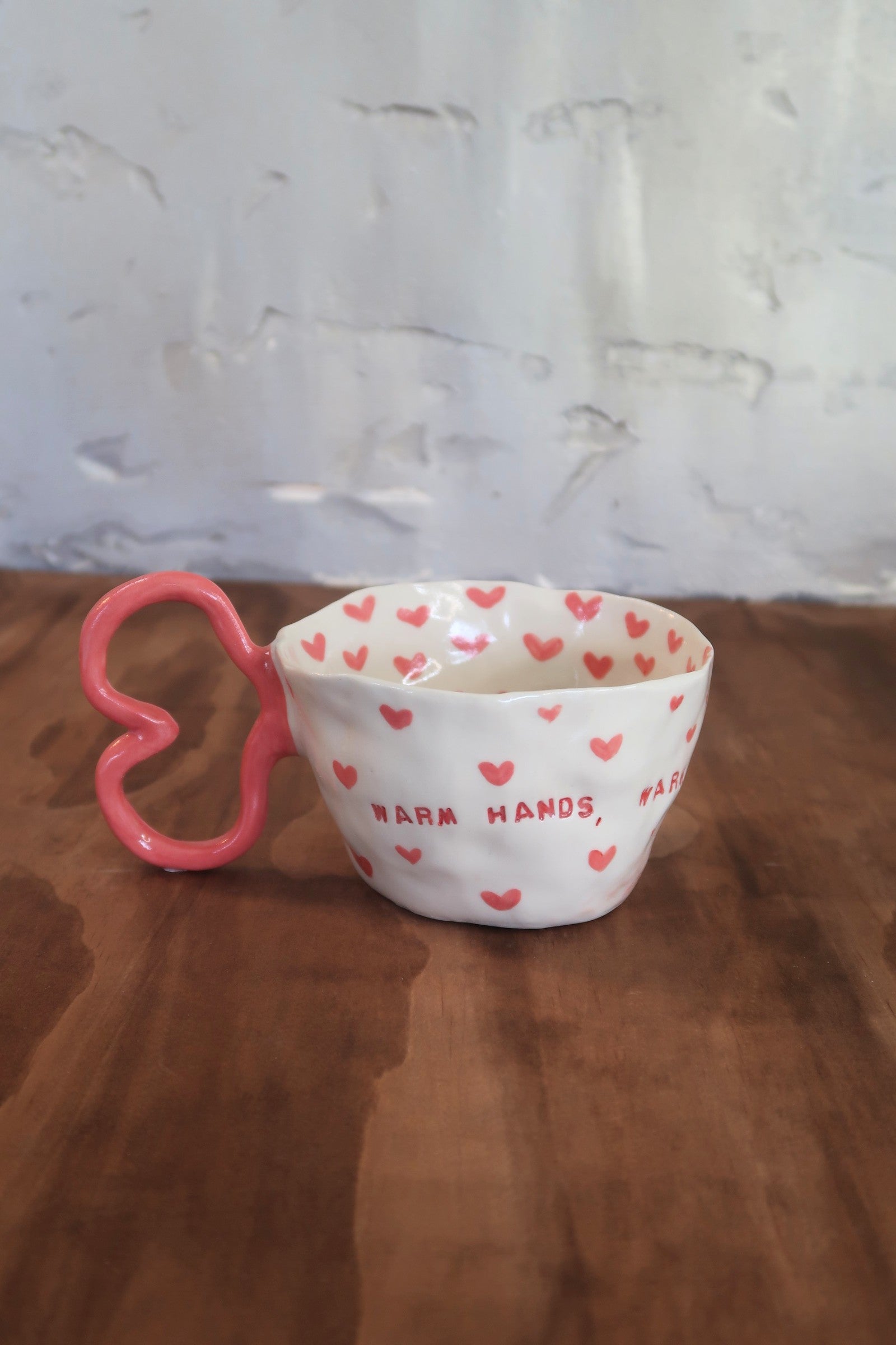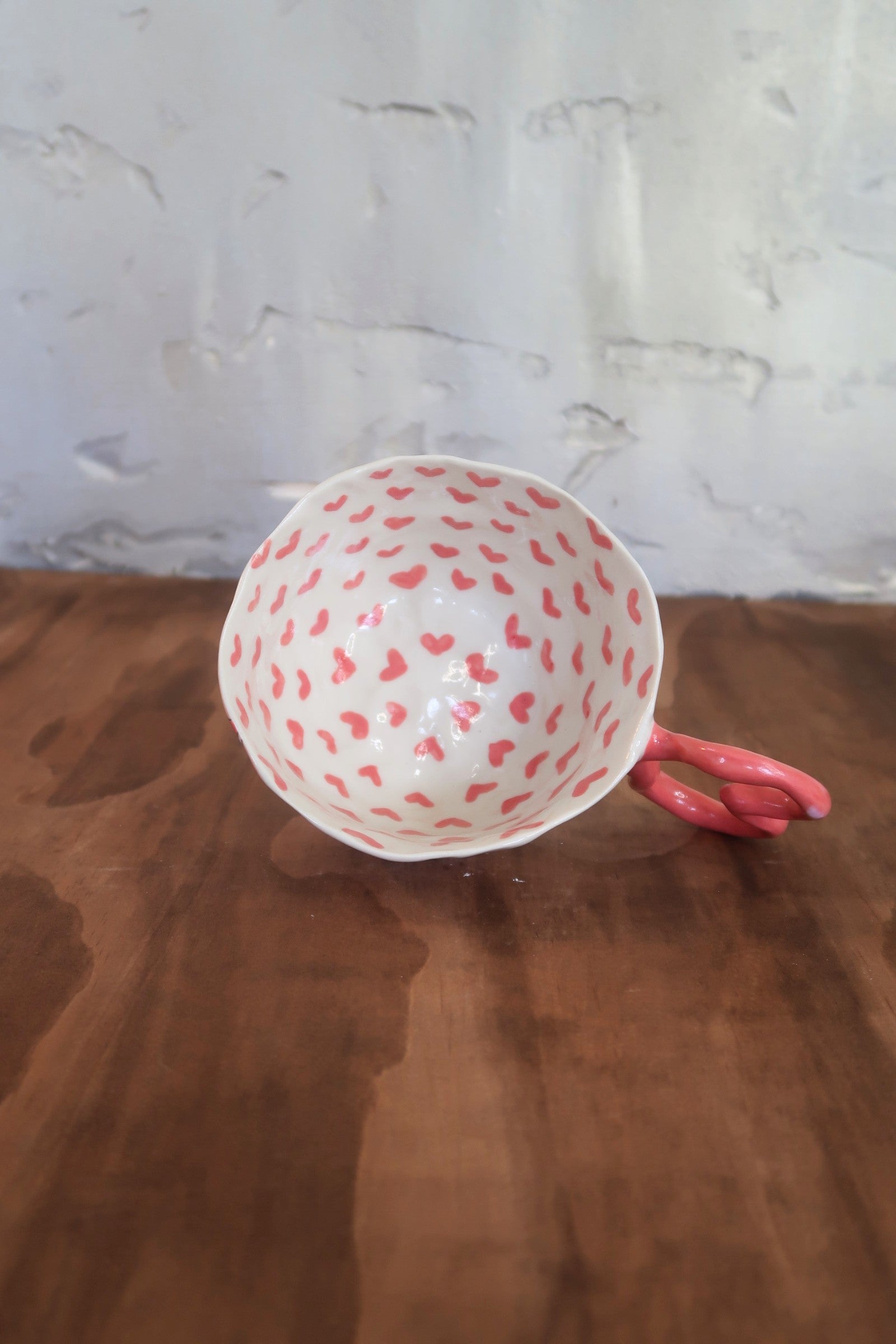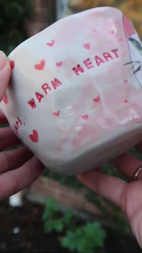 This hand-built mug features a sweet white cat with soft pink ears, dreamy yellow eyes, and a whimsical pink heart-filled background. Its organically shaped body and sculptural heart-handle add charm and comfort in equal measure.
