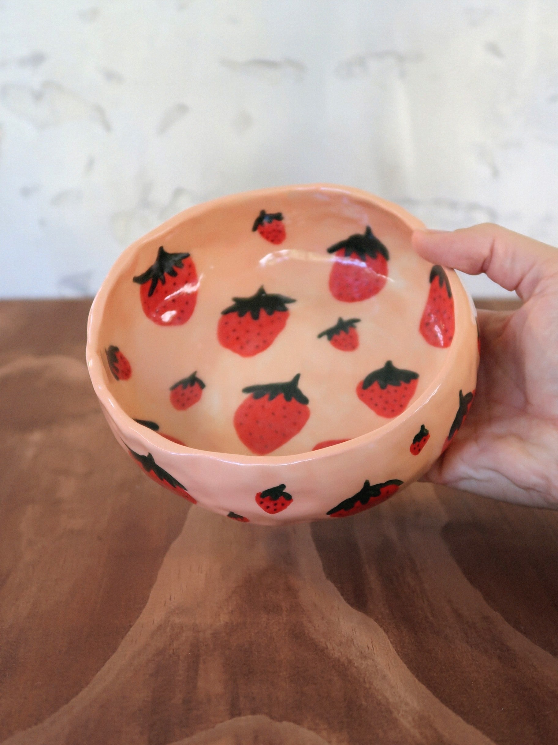 This joyful ceramic bowl bursts with the sweetness of hand-painted strawberries all over its soft peach body. It's playful, cheerful, and just makes you smile. Use it for snacks, fruits, or just as a happy little piece of art in your home. Each one is lovingly handmade, so every strawberry bowl has its own personality.