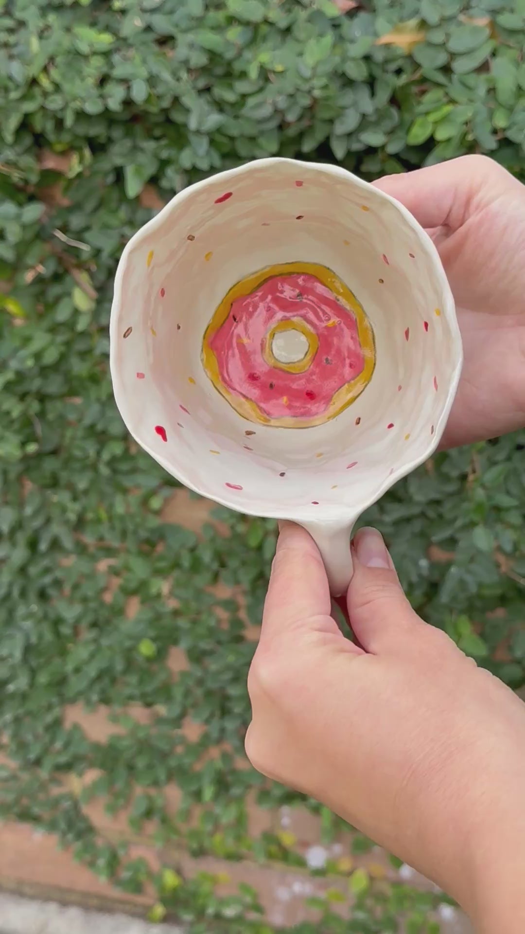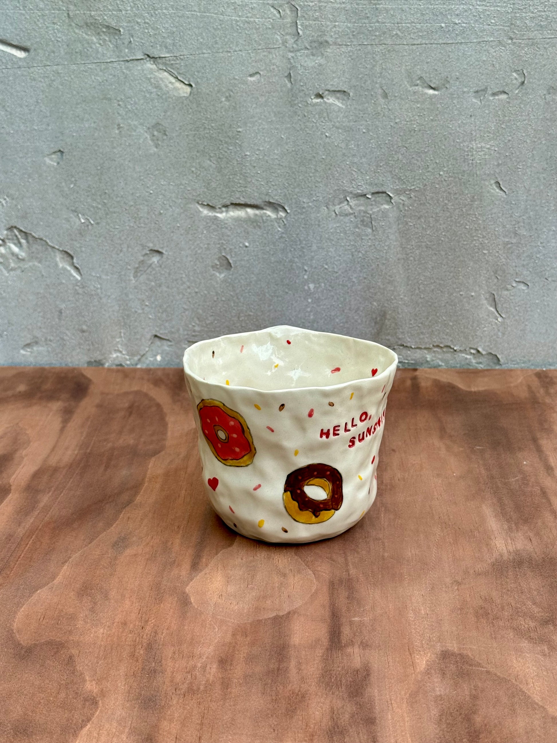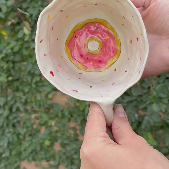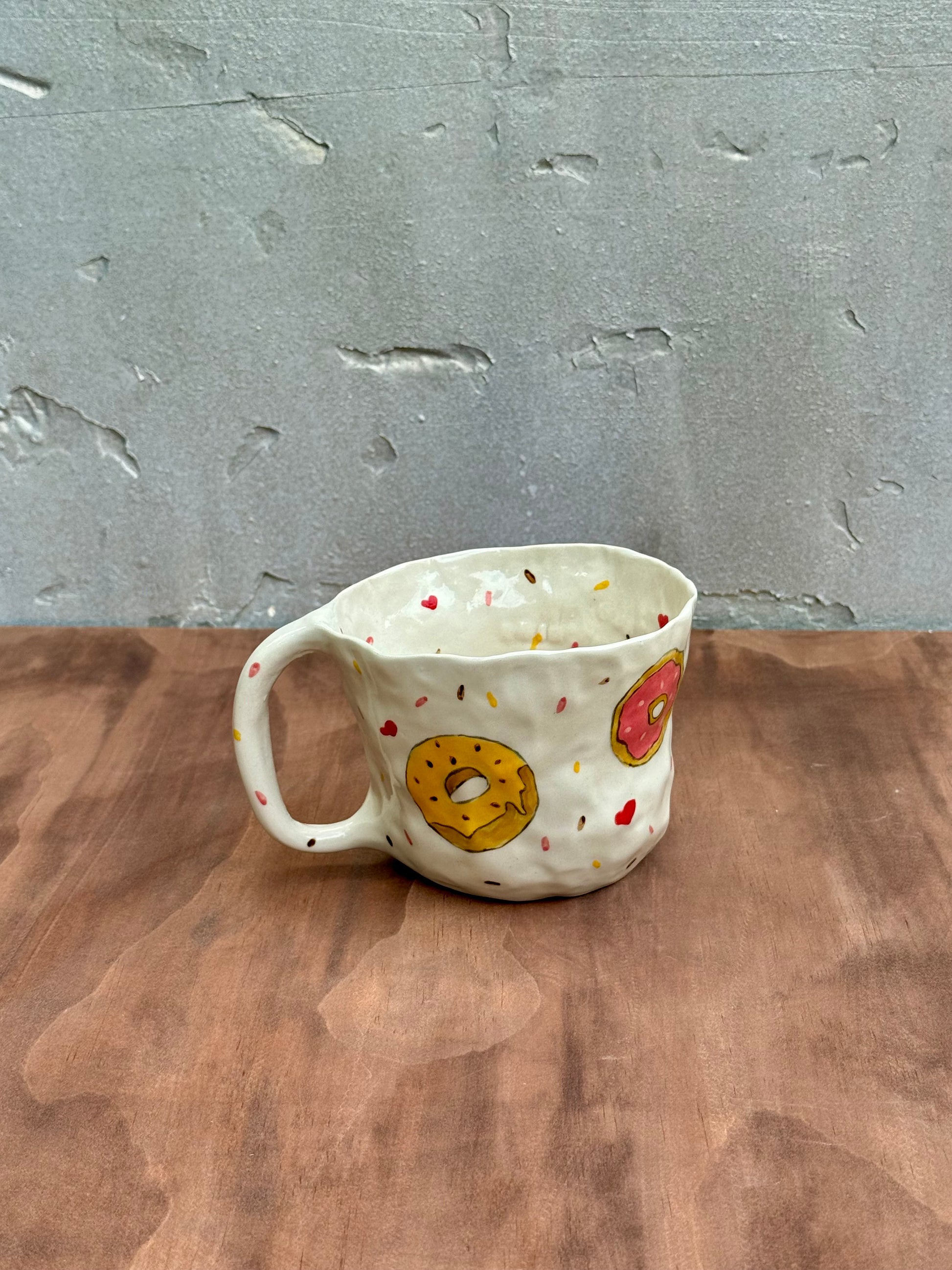 This hand-built mug features multiple frosted donuts in yellow, pink, and chocolate tones with sprinkled toppings and a dotted background. Its organically shaped body and sturdy handle add charm and comfort in equal measure.