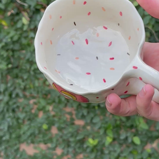 This hand-built mug features a small collection of donuts in frosted pinks and yellows with bright sprinkles, scattered across a dot-speckled surface. Its organically shaped body and dimpled texture add charm and comfort in equal measure.