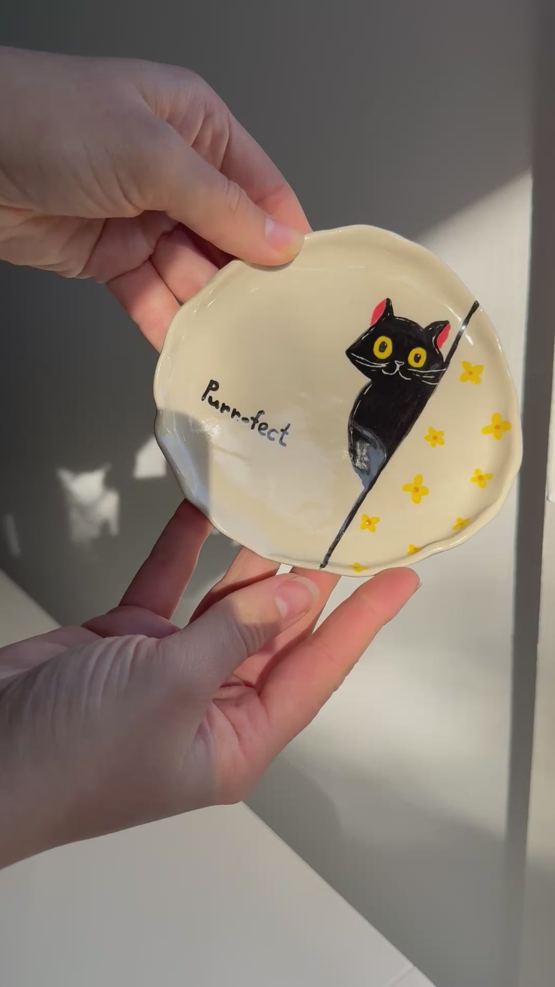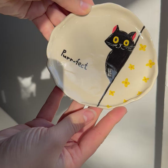 This hand-built dish features a curious black cat peeking from the edge, surrounded by golden flowers and the word “Purr-fect.” Its softly irregular shape adds charm and individuality.