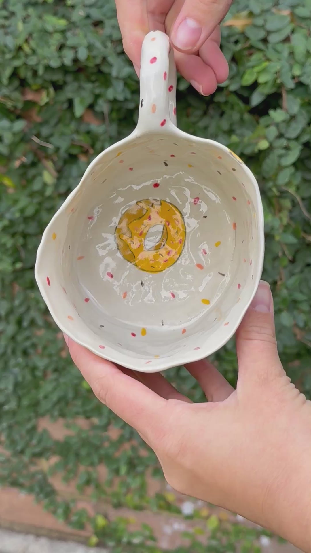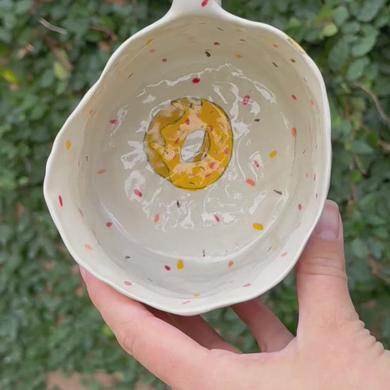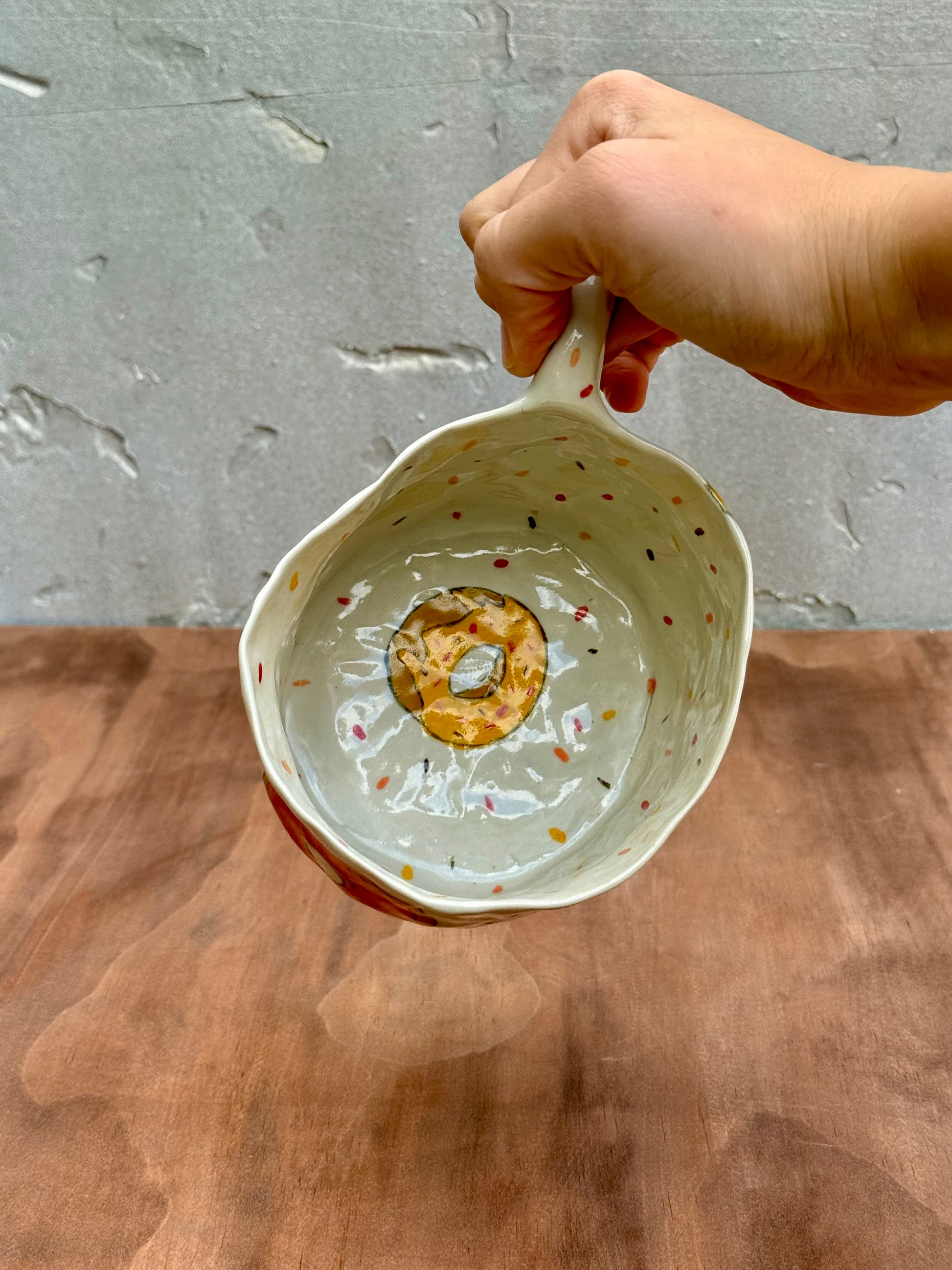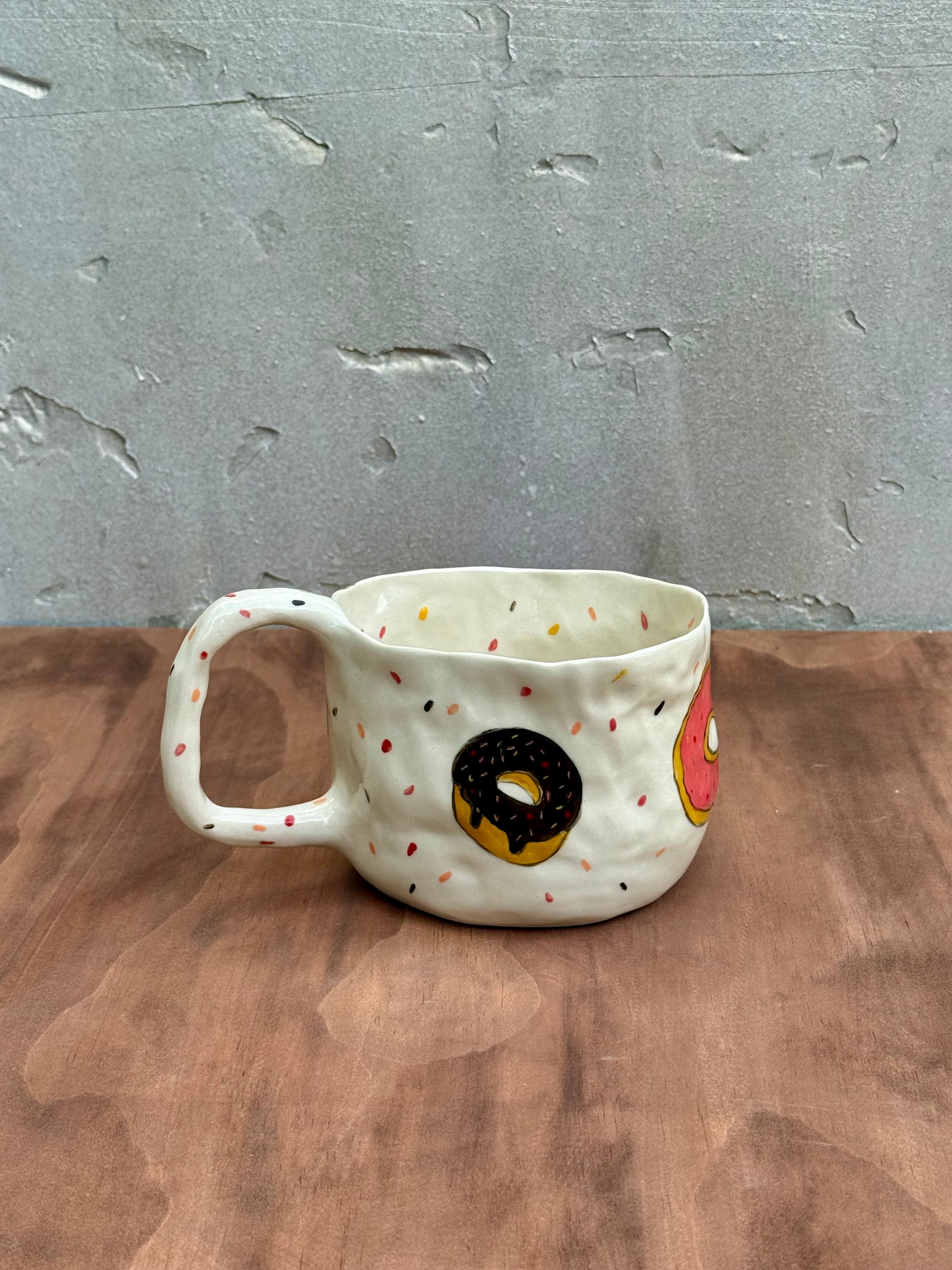 This hand-built mug features an assortment of donuts in different frosting styles and cheerful sprinkles. The shape is softly irregular—its wonky form makes it even more lovable. Its organically shaped body and wide handle add charm and comfort in equal measure.