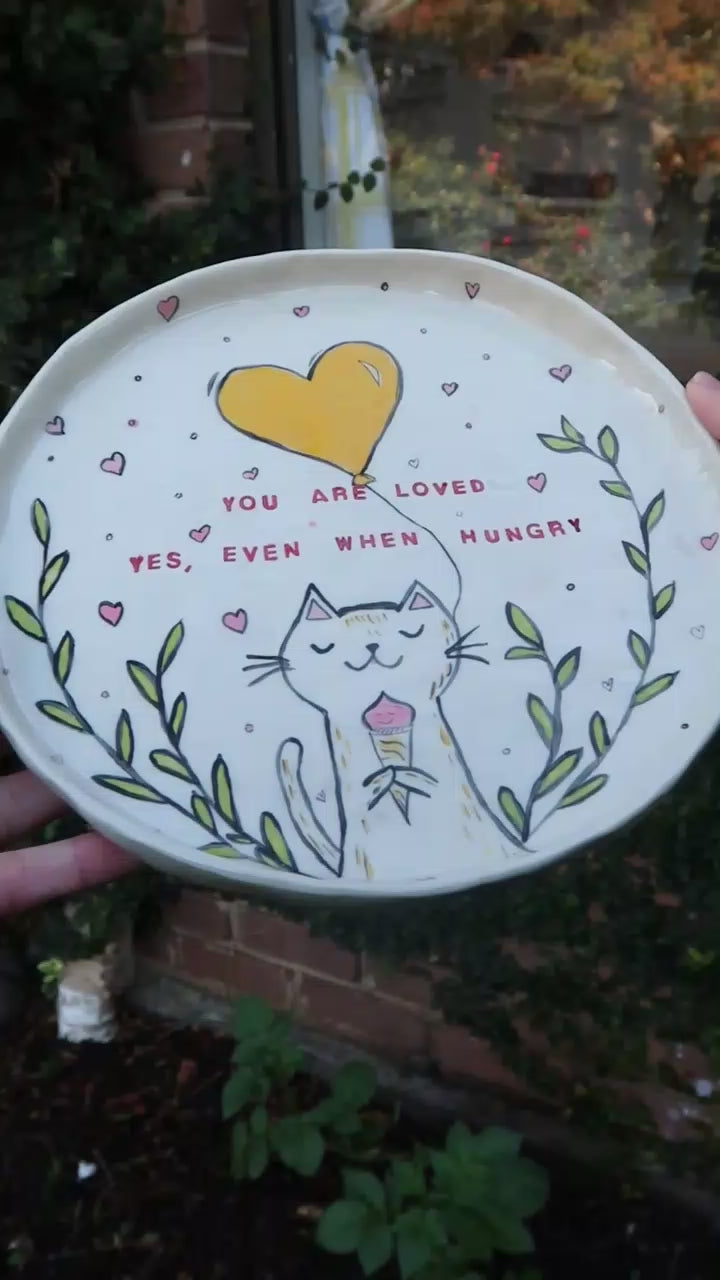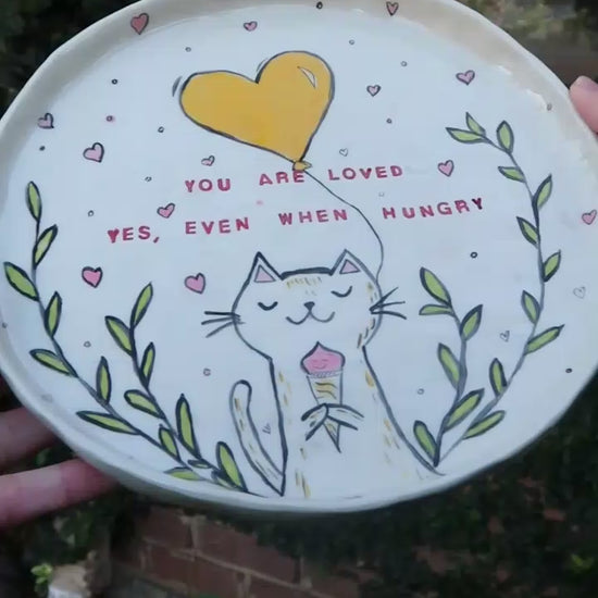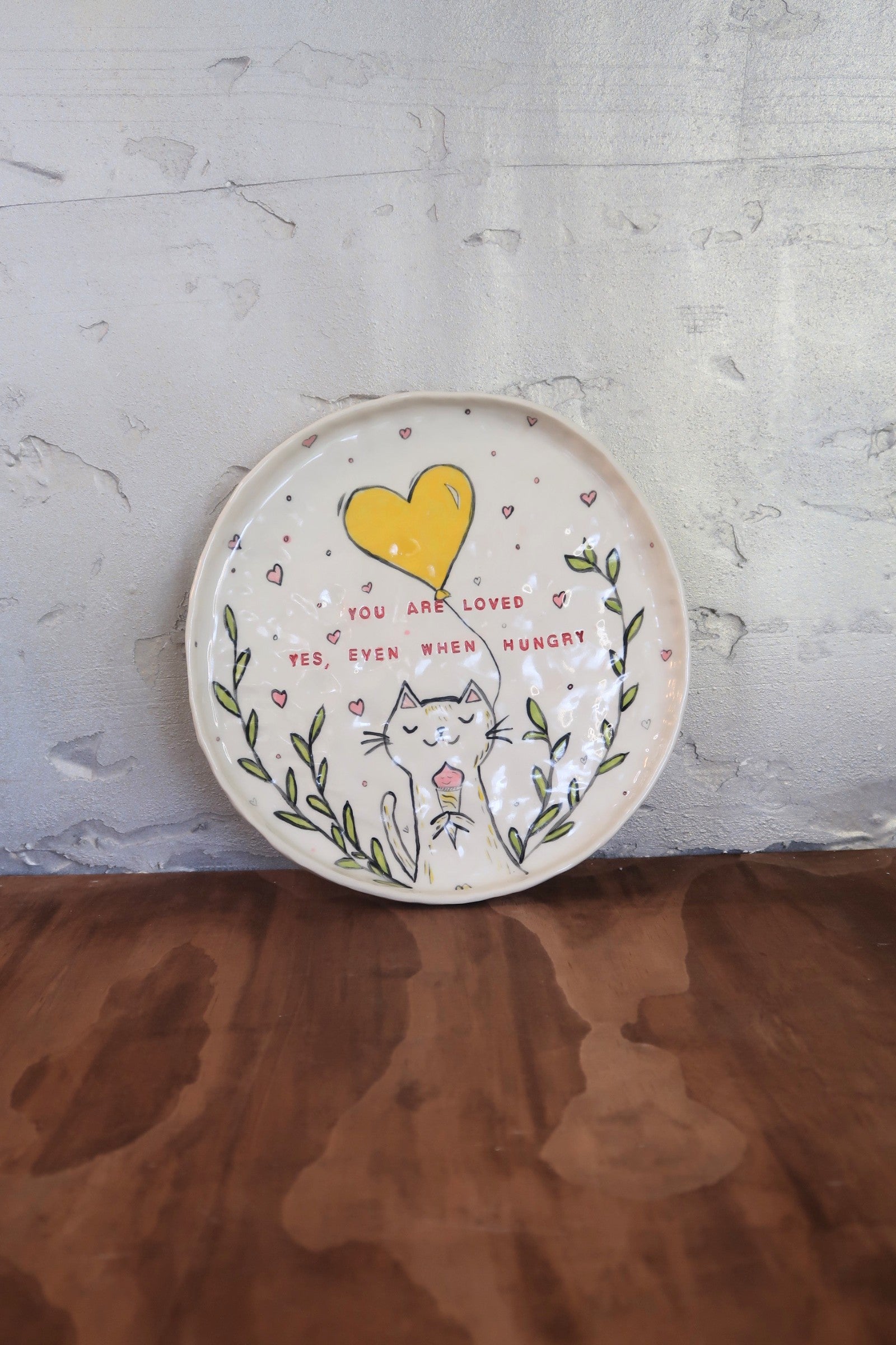 With a heart-shaped balloon and a cheerful little cat, this plate carries a heartfelt message: "You are loved. Yes, even when hungry!" Whimsical, thoughtful, and full of charm.